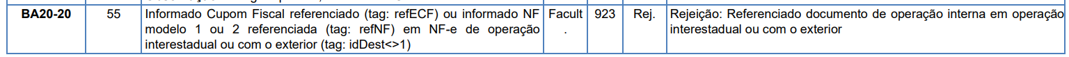 A Rejeição 923 pode ocorrer quando uma NF-e for emitida com operação interestadual ou com o exterior (tag: idDest<>1) e referenciado um Cupom Fiscal (tag: refECF) ou informado NF modelo 1 ou 2 referenciada (tag: refNF) emitido em operação interna (tag: idDest=1)
