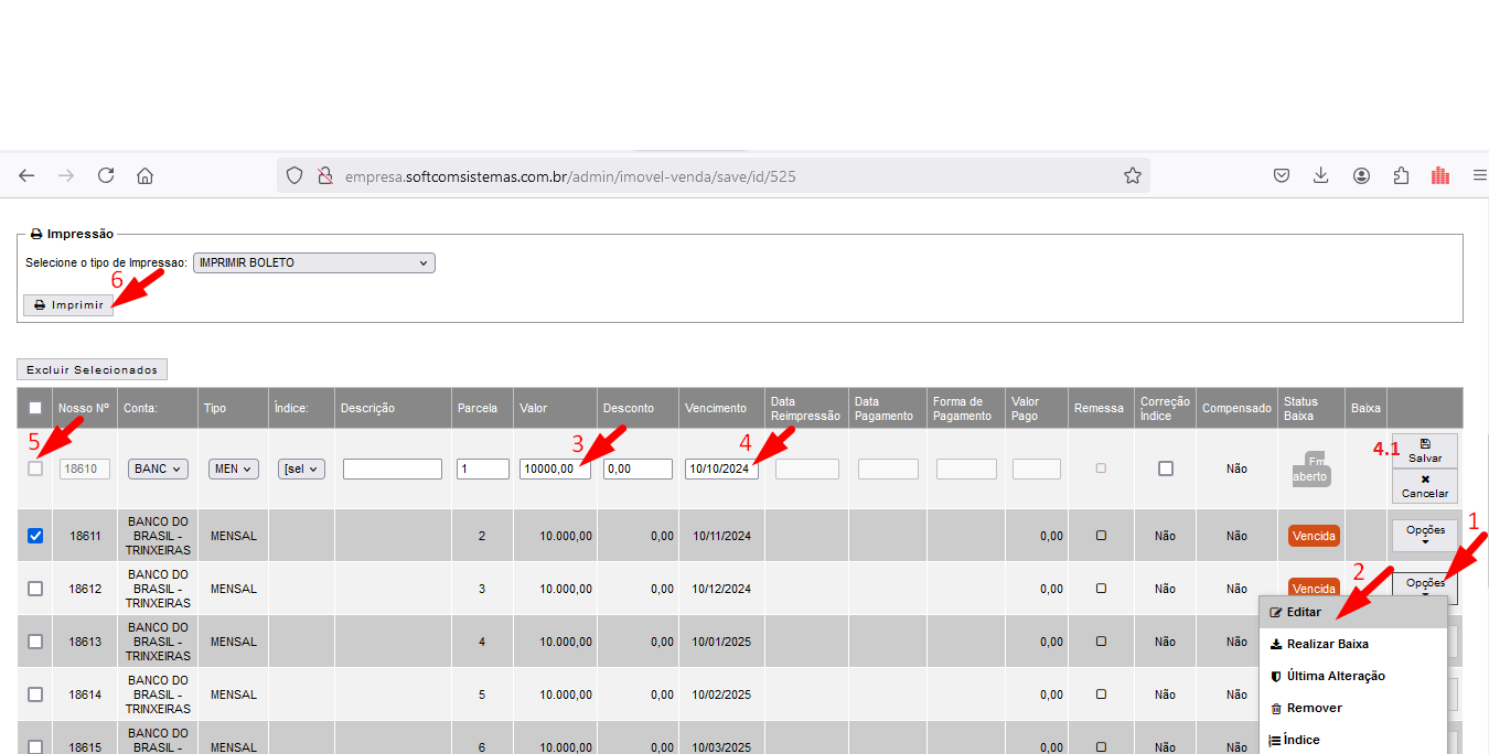 1 Opções 2 Editar 3 Inserir o novo Valor 4 Nova data de Vencimento e clicar 4.1 em Salvar 5 Selecionar o Titulo 6 Imprimir ou Salvar em PDF.