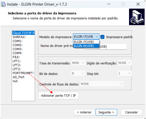 Passo 5: Após isso selecione o modelo da impressora e click em adicionar porta TCP IP