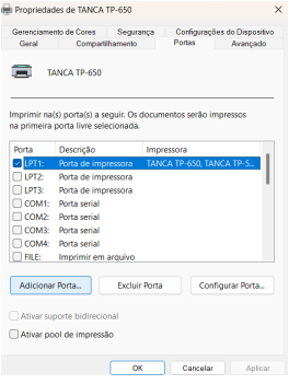 Passo 3: Após fechar o menu de instalação de impressora digitar Windows + R e digitar o comando Control Printers Localize a Impressora instala estará com o nome TANCA TP-650 vá em propriedades e clique em Adicionar porta