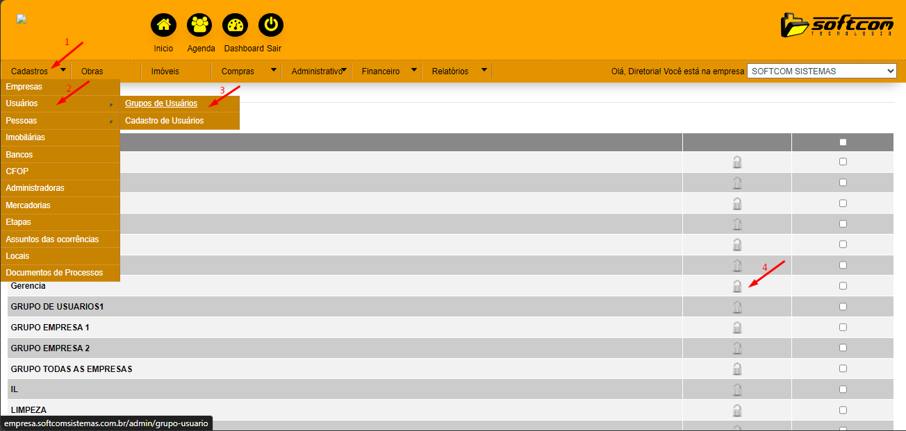 1 - Cadastros 2 - Usuários 3 - Grupos de Usuários 4 - Cadeado