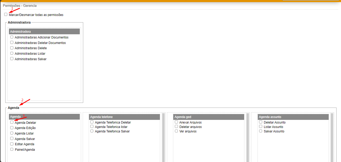 Marcar ou desmarcar os grupos de permissões manualmente de forma individual ou se o funcionário tiver permissão geral marcar a flag "Marcar todas as permissões"