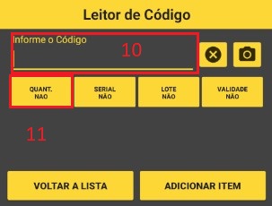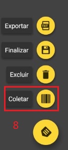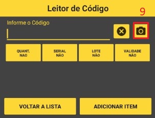 Passo 6: Vamos coletar!!!! clique em (7) e depois (8). Vai abrir a tela onde você pode digitar o código/Ean/referencia de sua mercadoria, você também pode usar um leitor de codigo de barras junto com cabo OTG, ou a camera (9) do seu aparelho.