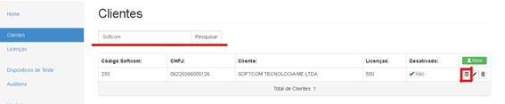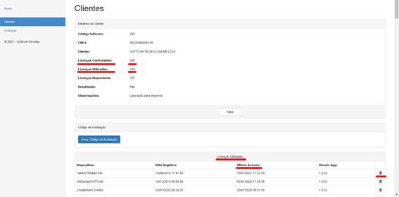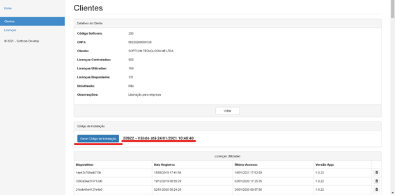 Passo 4: No detalhe do registro validar se as licenças disponíveis limitaram a quantidade licenças contratadas , caso sim, será necessário observar o último acesso do app para que seja excluído e assim gerado um novo código de instalação.