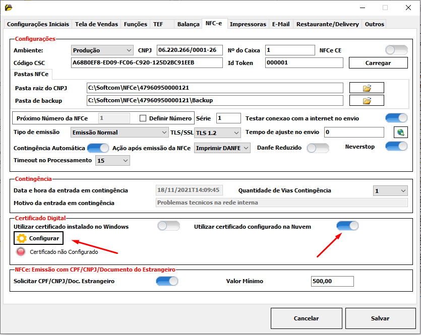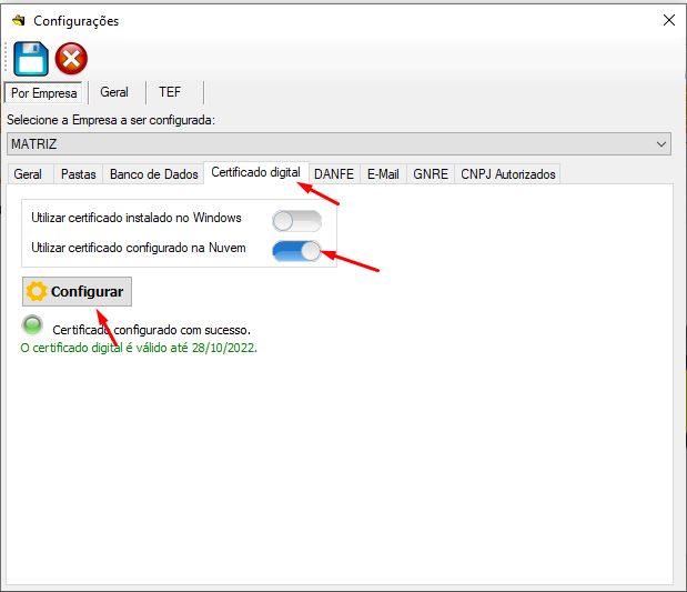 1.2. Abra o Emissor nas configurações > Aba Certificado Digital, marque a flag mostrada na imagem e clique em Configurar;