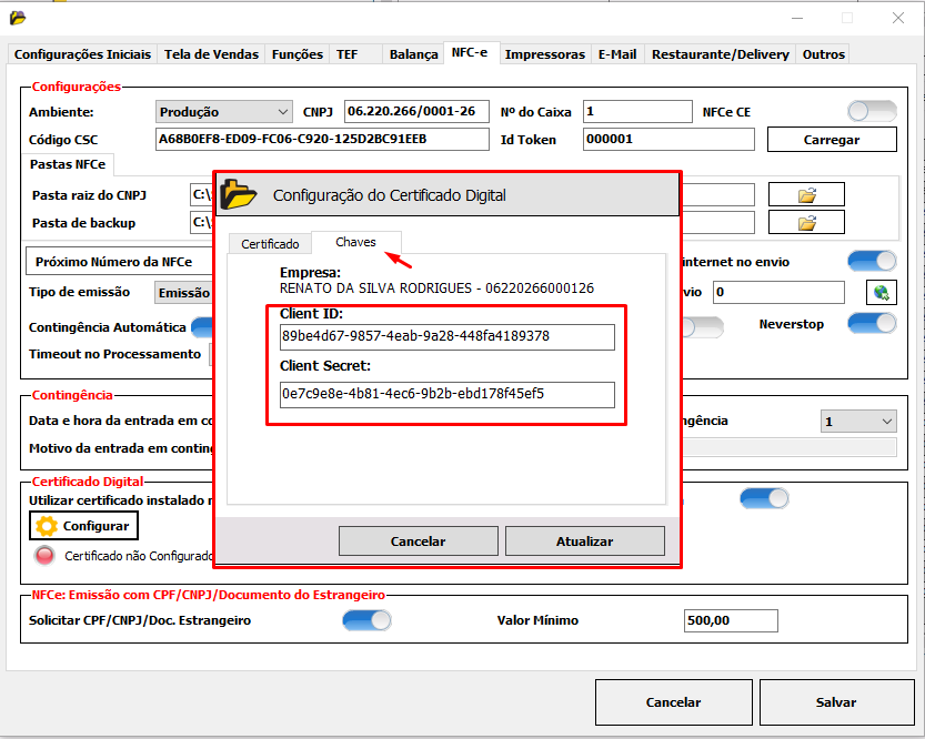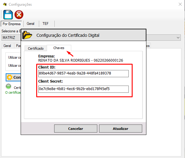 1.2. Na próxima aba, Chaves, coloque as informações coletadas do Portal de Serviços, e clique em Atualizar;
