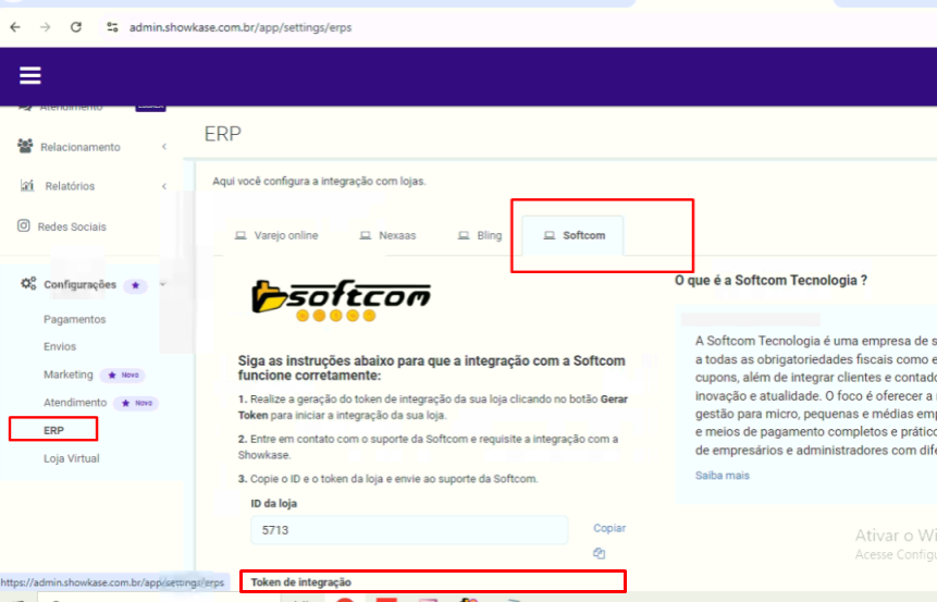 3. Na seção ERP , vá até a aba Softcom. Copie o Token de integração exibido.