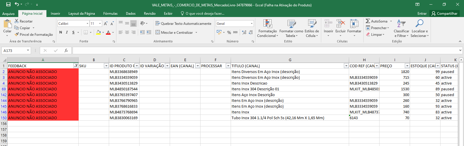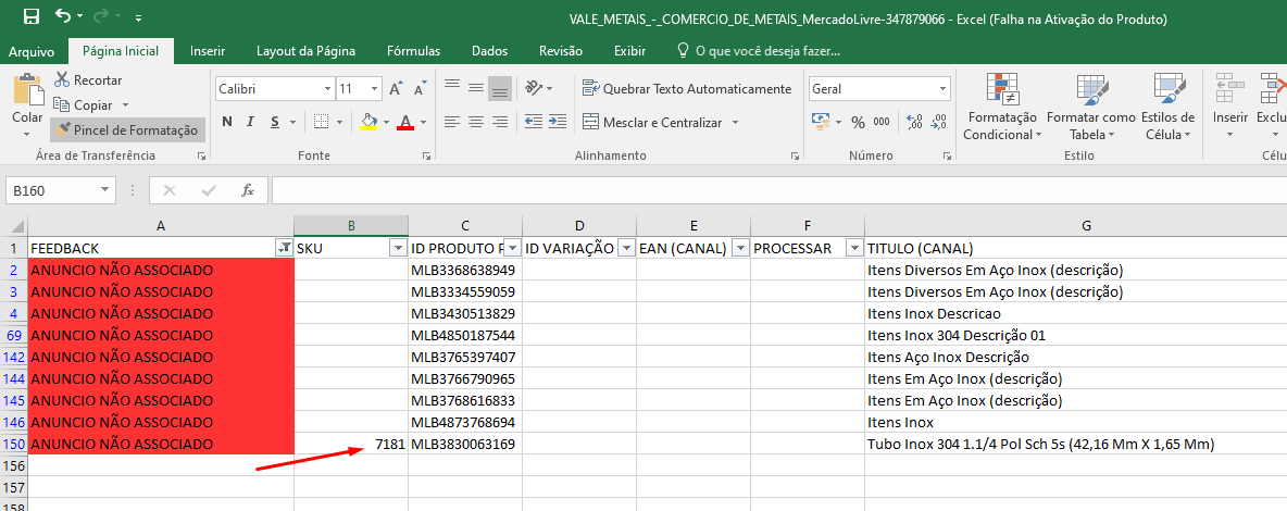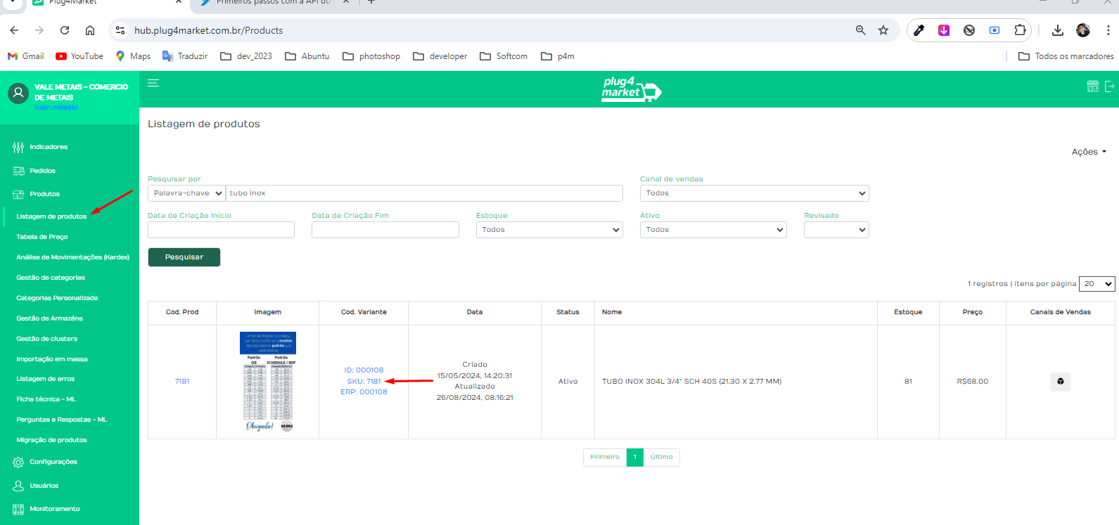 4. O SKU deve ser consultado no Plug4Market. Por exemplo, vamos realizar o processo com a mercadoria "Tubo Inox 304...".