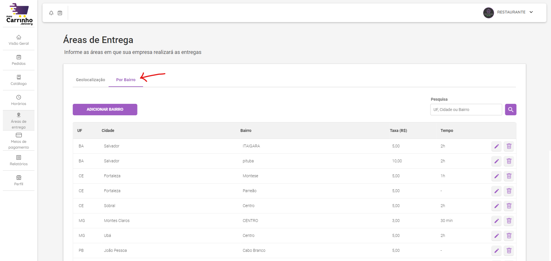 - O cadastro das Áreas de Entrega por Bairro é mais indicado para cidades do interior, onde o módulo de geolocalização ainda não realizou todo o mapeamento das ruas.