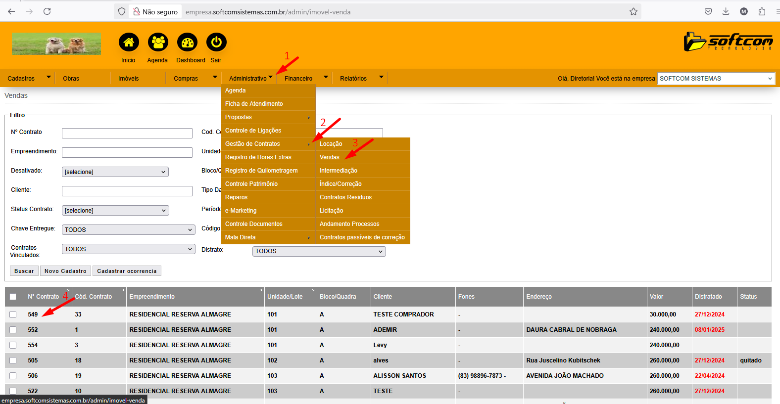 1 Administrativo 2 Gestão de Contratos > 3 Vendas 4 Selecionar o registro abaixo nos resultados