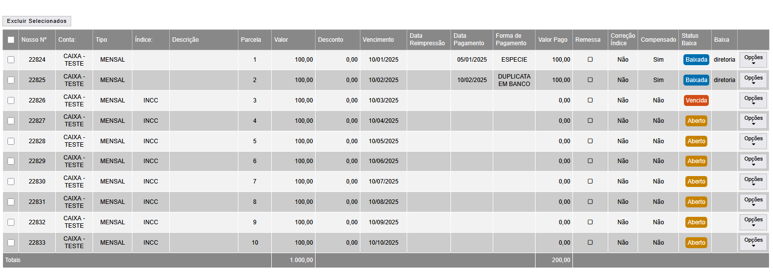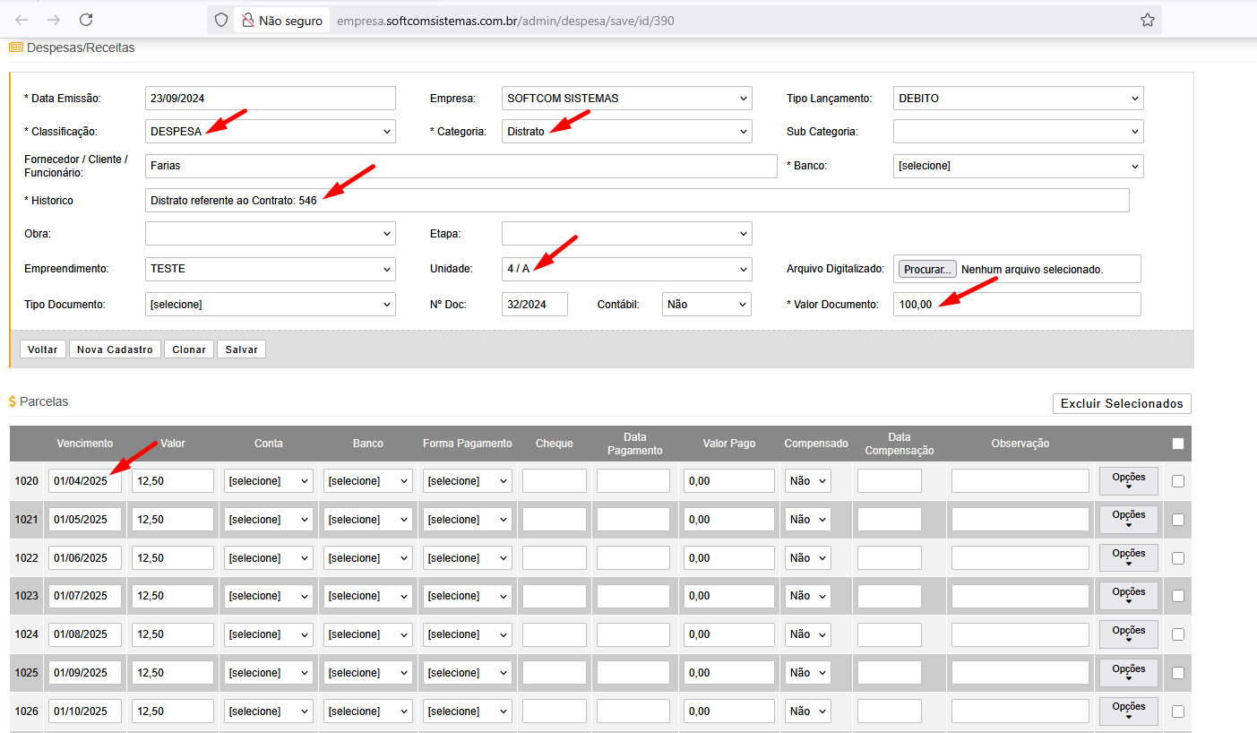 Nesta tela conterá os dados da Despesa gerada, com o número do contrato, Unidade, Valor, Empreendimento, e as parcelas logo abaixo com a data considerando a regra aplicada no ponto 6 anterior.