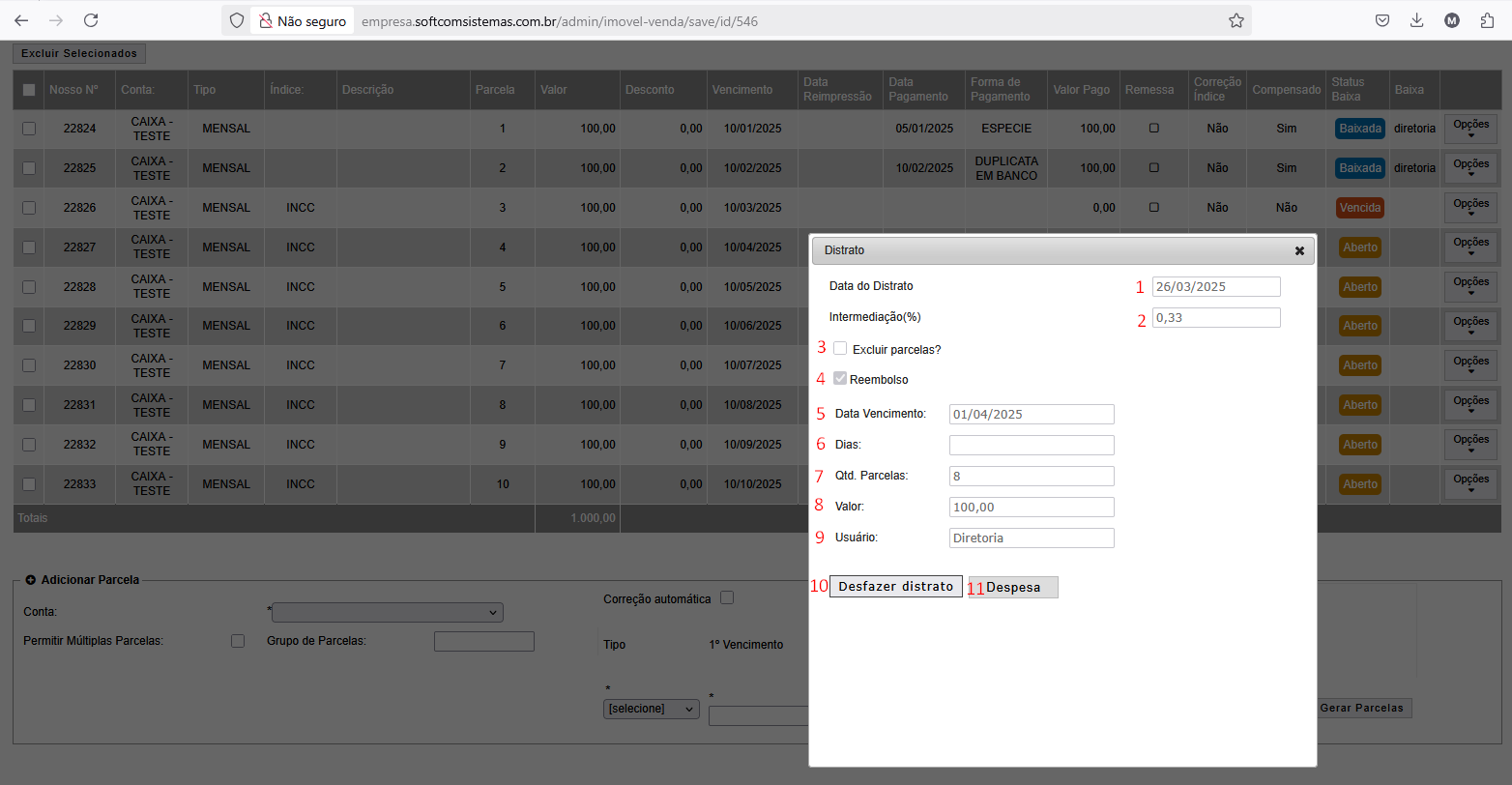 1 Data da realização do Distrato que pode ser a data atual ou retroativa 2 Porcentagem que será utilizada na Intermediação que foi acordado no momento da criação do contrato entre as partes envolvidas 3 Obs.: Selecione a caixa "Excluir Parcelas" acima caso deseje excluir todas as parcelas abertas à partir do dia informado, senão basta desmarcar 4 Reembolso é o valor que terá que pagar do Distrato que será gerado no contas a pagar e irá habilitar os demais campos 5, 6, 7, 8 e 9 para preenchimento 5 Data de inicio da primeira parcela 6 Preencher somente se quiser determinar um intervalo de dias entre cada boleto, senão será considerado sempre o dia estabelecido no Data Vencimento 7 Quantidade de parcelas que será gerado com base no valor do ponto 8 Valor total que será dividido pela quantidade de parcelas do ponto 7 9 Usuário logado na realização da ação de Confirmar 10 Ação para reverter o Distrato realizado 11 Irá direcionar para a Despesa criada no Despesas/Receitas