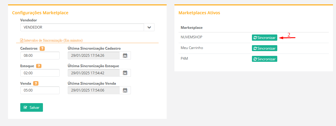 2. Na tela de configurações de Marketplace, na sessão "Marketplaces Ativos", localize o marketplace recém-adicionado e clique em "Sincronizar".