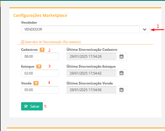 1 Vendedor: Que será associado para as vendas no momento da importação 2 Tempo de sincronização dos Cadastros, valor mínimo de 5 minutos (300 segundos) 3 Tempo de sincronização dos Estoque, valor mínimo de 2 minutos (120 segundos) 4 Tempo de sincronização das Vendas, valor mínimo de 3 minutos (180 segundos) 5 Salvar para que as Sincronizações sejam criadas no BD Softcom Tasks, na tabela [Schedules]