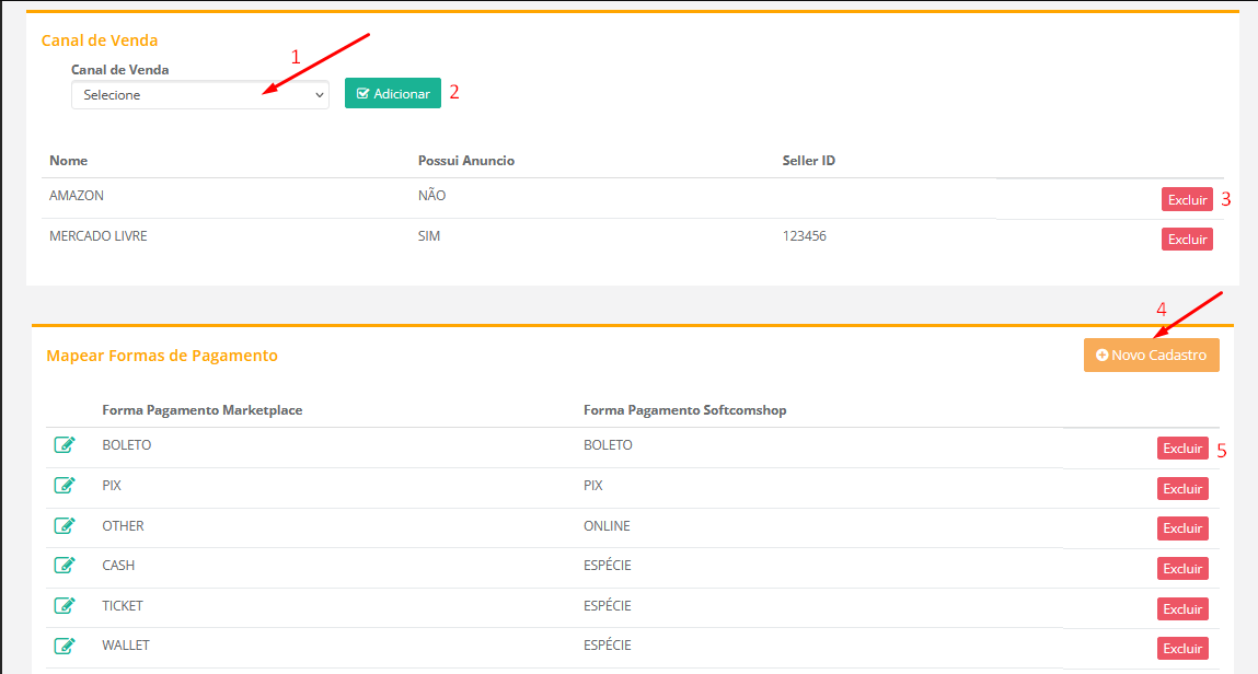 1 Canal de Venda: Selecionar o Marketplace de destino das sincronizações presentes 2 Adicionar a seleção 3 Excluir um Marketplace presente na listagem 4 Mapear nova forma de pagamento para utilização nos Marketplaces acima.