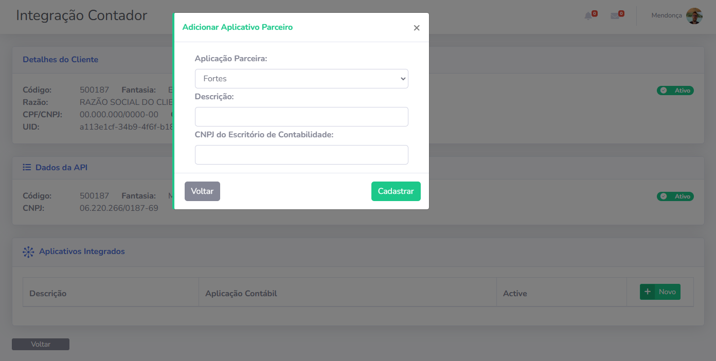 2. No Bloco "Aplicativos Integrados", clicar em Novo e na janela que será aberta, selecionar a Aplicação Parceira Fortes, preencher uma descrição e abaixo o CNPJ do Escritório da Contabilidade.
