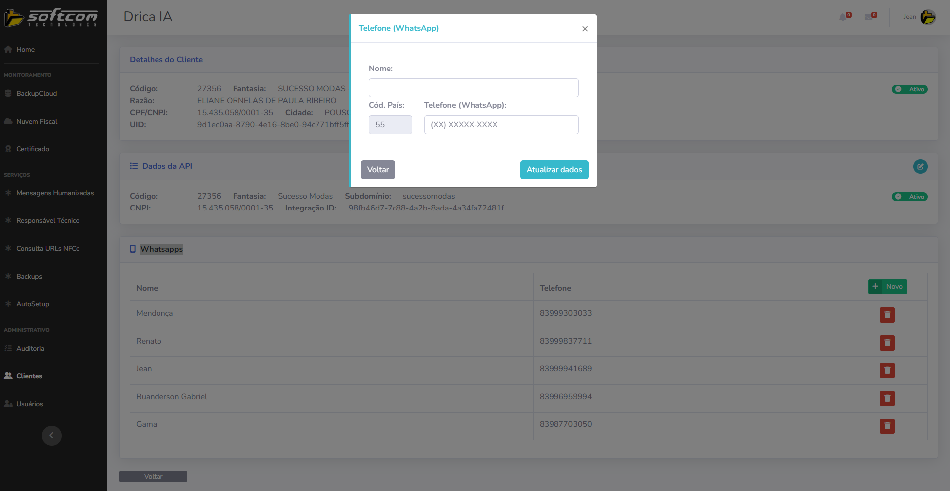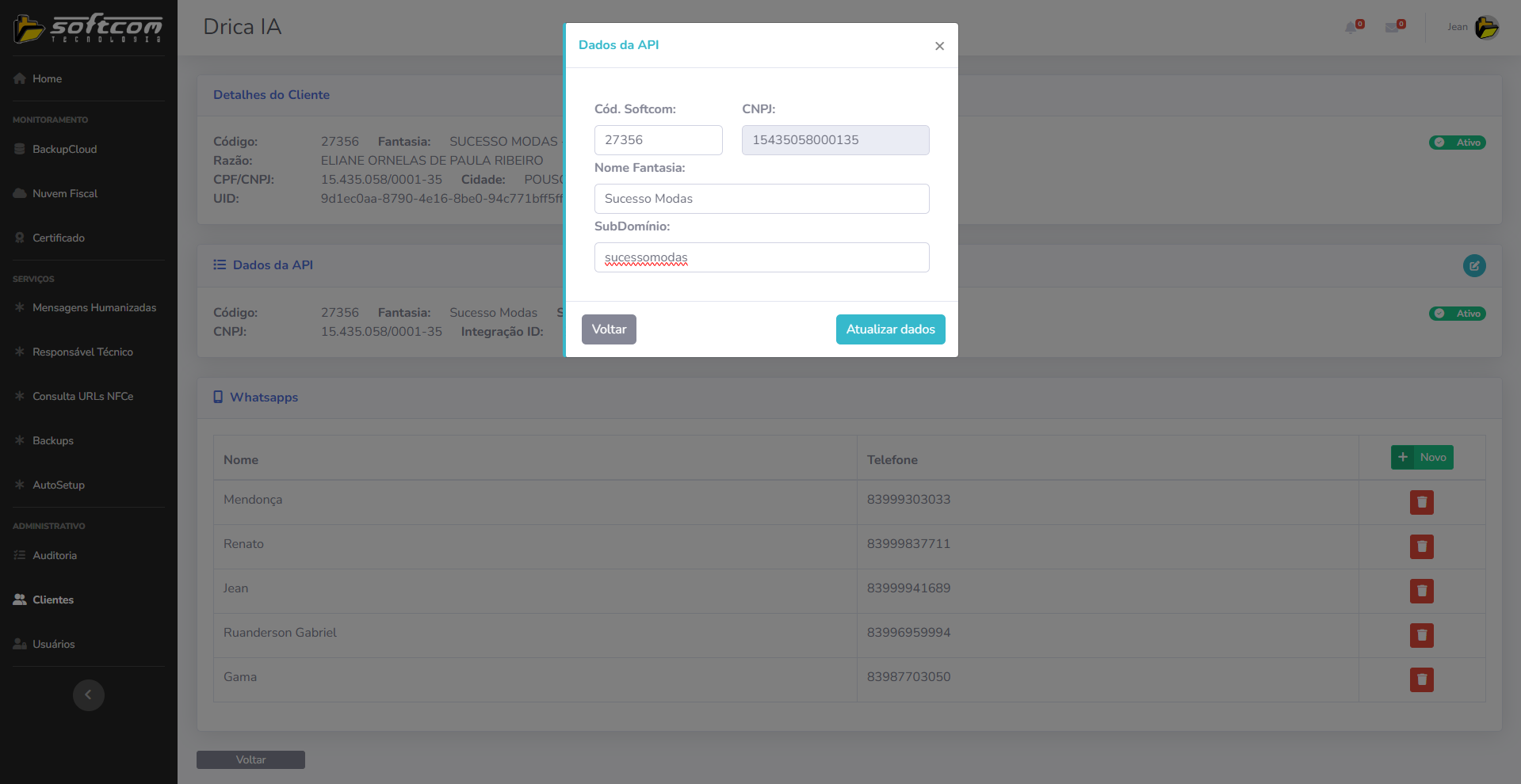 Tags: dricaia, softcomshop, whatsapp, integração, assistenteia, api, portaldeserviços, subdomínio, usuáriosautorizados, faca