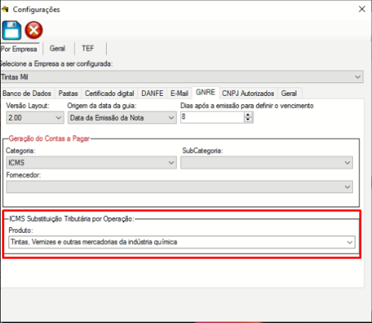 2. Preencher o campo " Produto " na aba de GNRE > ICMS Substituição Tributária por Operação nas configurações do emissor.**