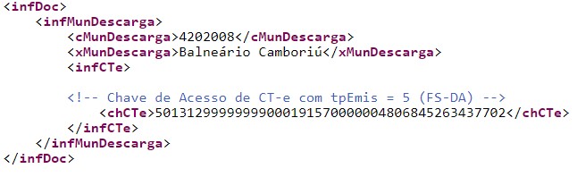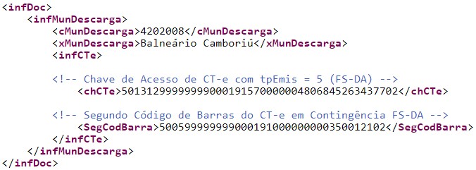 Quando for emitido um MDF-e e for informada Chave de Acesso de CT-e em Contingência FS-DA (tpEmis = 5) e o Segundo Código de Barras do CT-e, não for informado, será retornado a rejeição "602 - Segundo Código de Barras deve ser informado para CT-e em contingência FS-DA".