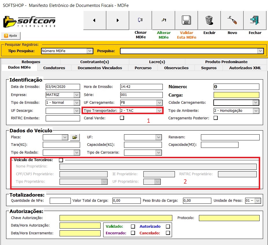 1 - Necessário informar "Tipo do Transportador" (1) na tela principal do MDF-e, quando for transporte em veículo de terceiros (2).