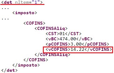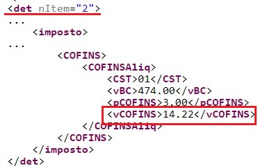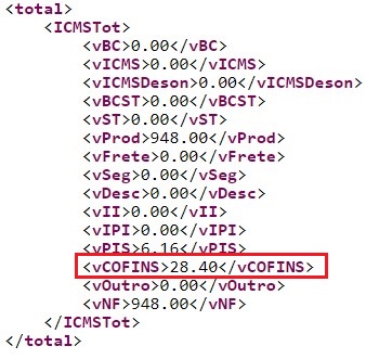 Observe que a soma dos 2 itens na tag vCOFINS da 28,44 porém abaixo o totalizador você pode ver que deu 28,40.