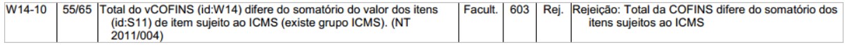 Rejeição 603: Total da COFINS difere do somatório dos itens sujeitos ao ICMS.