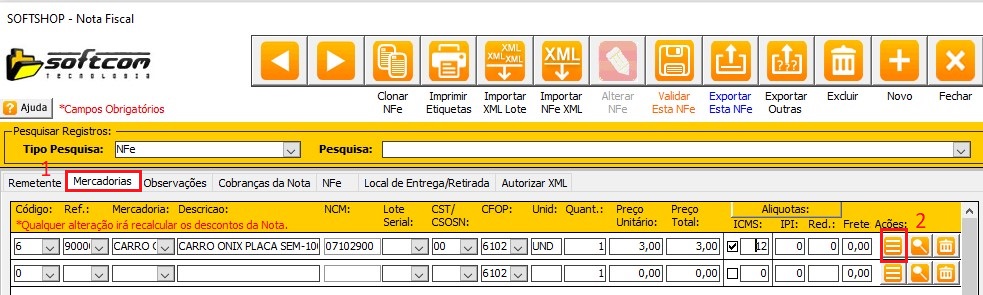 3- No Softshop verifique todos o itens da nota na aba Mercadorias (1), botão Ações (2), Detalhes do Imposto (3).