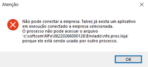 Não pode conectar a empresa. Talvez já exista um aplicativo em execução conectado a empresa selecionada. O processo não pode acessar o arquivo 'c:\softcom\NFe\06220266000126\Enviado\nfe.proc.loja' porque ele está sendo usado por outro processo.
