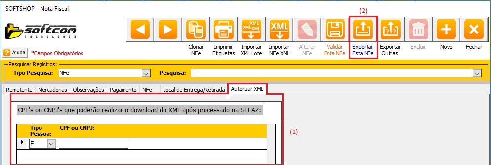 Para resolver, consulte a sua contabilidade para saber qual CNPJ ou CPF está cadastrado na SEFAZ. Em seguida, acesse a Nota Fiscal e na aba "Autorizar XML"(1) informe o CNPJ ou CPF correto da sua contabilidade. Caso não possua, informe o CNPJ da SEFAZ Bahia (13.937.073/0001-56), exporte (2) e processe a nota novamente.