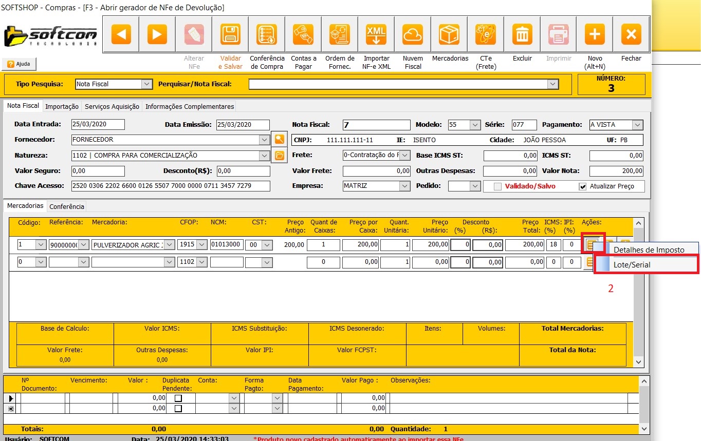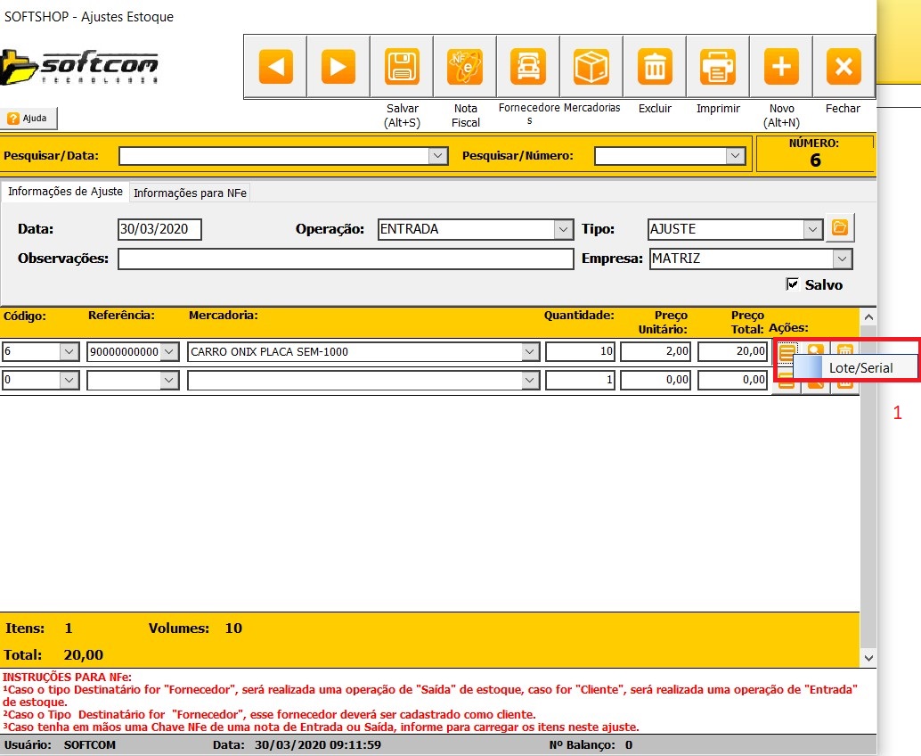 1 - Os lotes são preenchidos na tela de ajuste (1) de estoque ou na tela de entrada de notas (2) no botão serial.