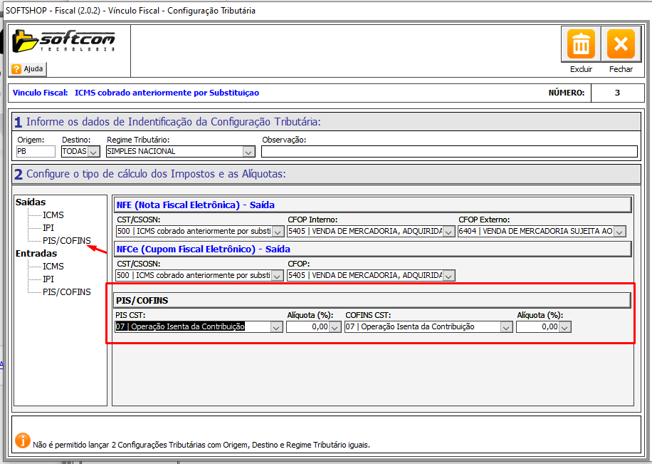 Essa mensagem aparece pois existem produtos lançados na Nota Fiscal que estão sem o CST do PIS preenchido ou o CST do PIS está preenchido com 03 (que não tem a sua linha implantada no Softshop).