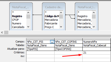 UPDATE NotaFiscal_Cabecalho INNER JOIN ([Cadastro de mercadorias] INNER JOIN NotaFiscal_Itens ON [Cadastro de mercadorias].[Código da Mercadoria] = NotaFiscal_Itens.Mercadoria_Codigo) ON NotaFiscal_Cabecalho.Registro = NotaFiscal_Itens.Registro SET NotaFiscal_Itens.NFe_CST_PIS = [TipoPIS], NotaFiscal_Itens.NFe_CST_COFINS = [TipoCOFINS]
