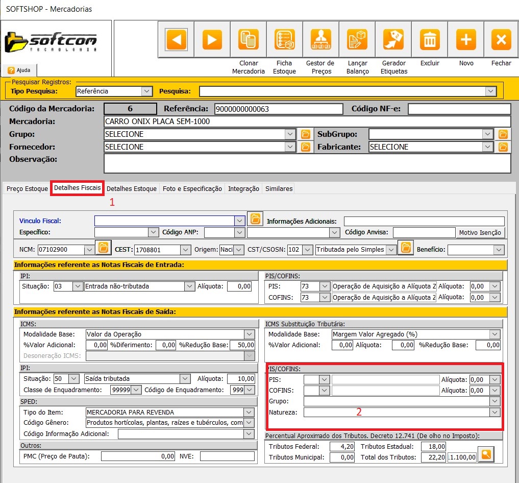 1. Acesse o cadastro das mercadorias da NF-e e procure a aba Detalhes Fiscais (1), e o grupo de PIS (2).