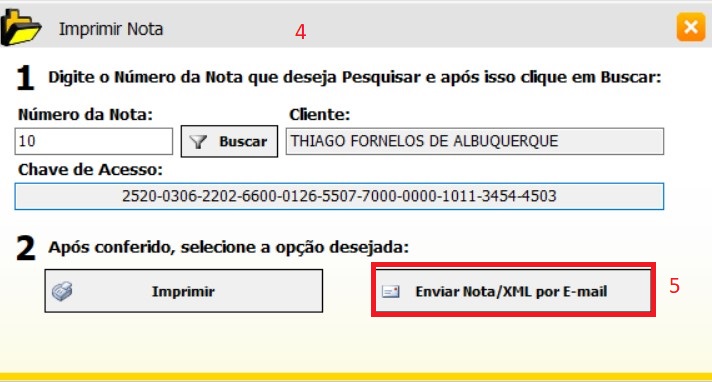 irá abrir tela abaixo (4). Aperte Enviar Nota/ XML por E-mail (5) .