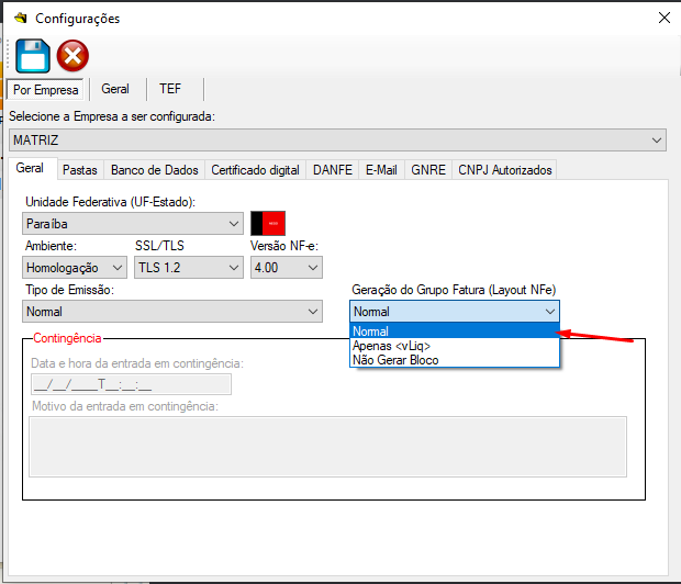 1.1. Na Geração do Grupo Fatura (Layout NFE) selecionar a opção "Normal".