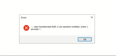 Emissor NF-e: Valor hexadecimal 0x00, é um caractere inválido. Linha 1, posição 1.