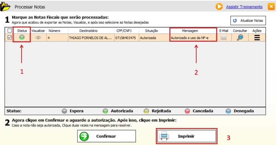 Após a consulta o protocolo de autorização é retornado pela Sefaz e a nota fica autorizada para impressão conforme imagem abaixo (1) ,(2) e (3).