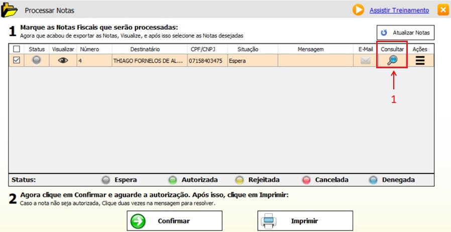 1 - Consultar o status da NF-e conforme figura abaixo (1).