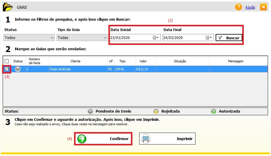 • Em Seguida, aparecerá uma tela mostrando alguns filtros que podem ser aplicados para encontrar as notas que serão emitidas os GNRE's. Localizar as notas por Data de Emissão (2). Pode ser Filtrado informações como Status das Guias Geradas e Tipos de Guias, ( No momento, apenas queremos processa-las, então ficará com o Status = Todos / Tipo da Guia = Todos). Selecionar as notas que serão geradas as Guias(3). Clicar no botão - " CONFIRMAR" (4).