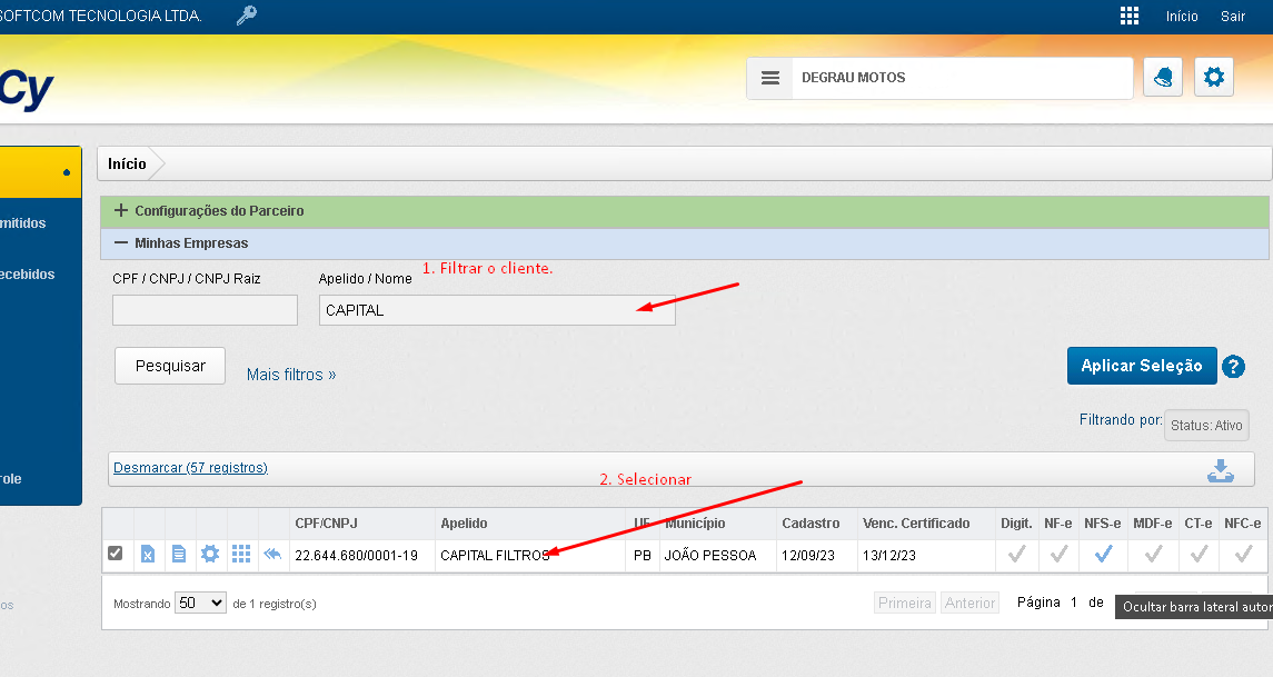 1306x724Causa: Cliente antes de contratar o serviço de emissão de NFS-e conosco, emitia pelo Portal Nacional. Porém ao tentar emitir pelo nosso sistema apresenta o erro "Falha na solicitação com status HTTP 401: Unauthorized." SOLUÇÃO: Tendo em vista essa particularidade de emissão do cliente, se torna necessário o cadastro da mesma no portal da MIGRATE (INVOICY). 1. Primeiramente, acessar o portal o Invoicy: Login (invoicy.com.br), através das credenciais(caso não saiba procurar apoio com o supervisor). 2. Filtrar o cliente e acessar o painel de controle do cadastro.