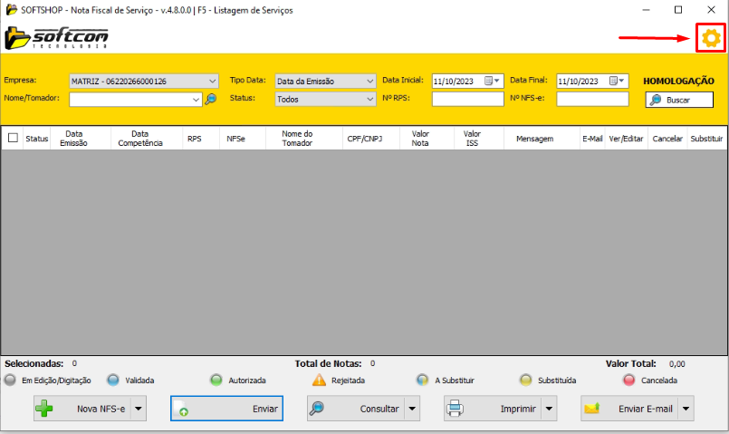 1. Acessar o ícone de configuração do emissor de NFSe.