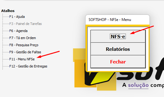 5. Na tela inicial do Softshop, acessar F11 - Menu NFSe > NFS-e.