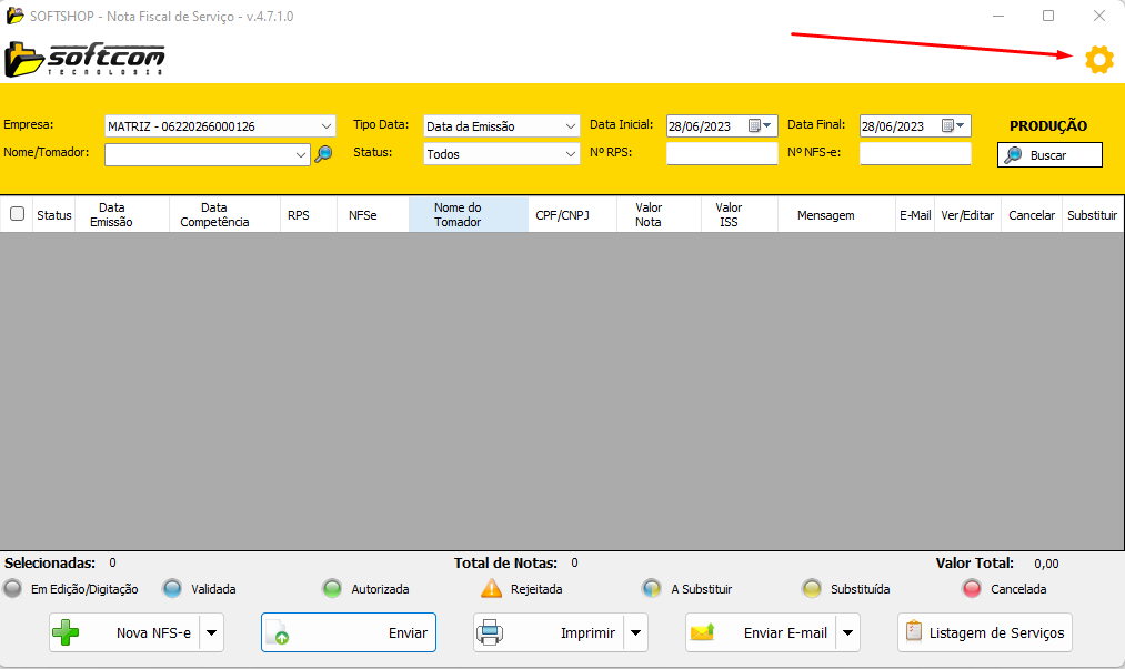 6. Na tela do Emissor, clicar na engrenagem de configuração.