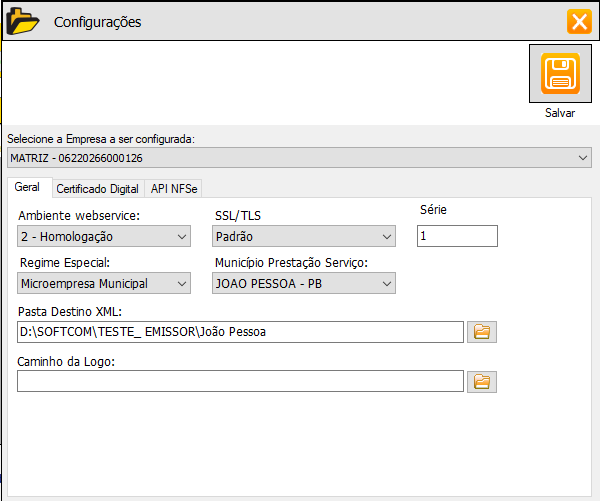 7. Na aba Geral , preencher obrigatoriamente a pasta de destino do XML. A logo poderá ser adicionada posteriormente.