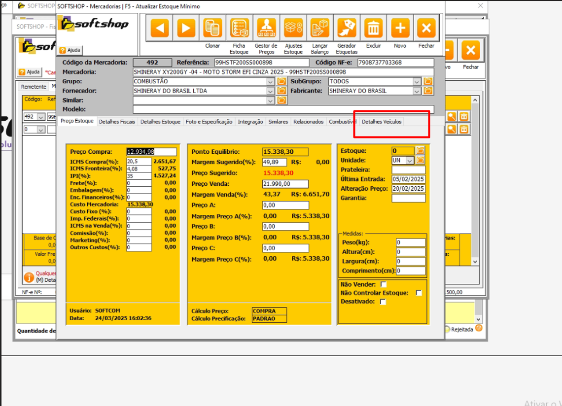 1- Abra o cadastro de produto que esta na NFe e vá ate aba detalhes veículos
