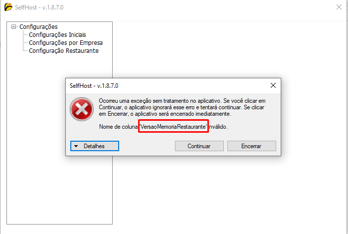 SELFHOST - Nome de coluna "VersaoMemoriaRestaurante" inválido.