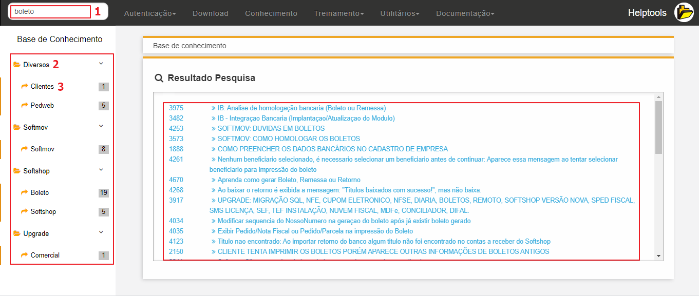 1- BUSCA: Ao realizar busca (1), serão exibidos os resultados agrupados por SOFTWARE (2), no nível inferior serão agrupados por GRUPO (3). No PDV por exemplo irão aparecer apenas publicações para o produto PDV - Softshop Caixa, a visualização será mantida nessa organização, mas ainda serão feitas melhorias visuais e de usabilidade.