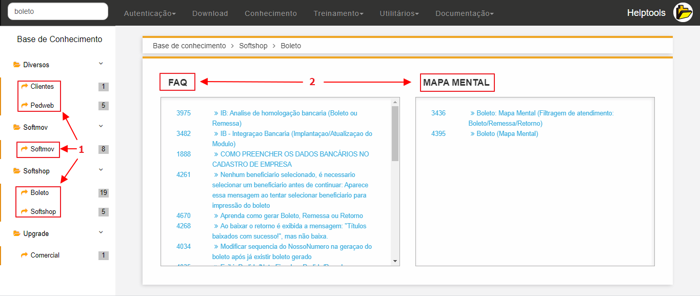 2- RESULTADOS: Ao selecionar um GRUPO desejado (1), os resultados ainda serão filtrados por Tipo/Finalidade (2), como FAQ, MAPA MENTAL ou TREINAMENTO.