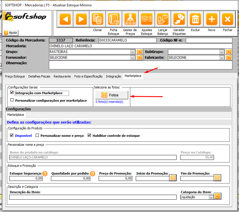 - Acesse o cadastro de mercadorias e, na aba Marketplace, clique no botão "Fotos".