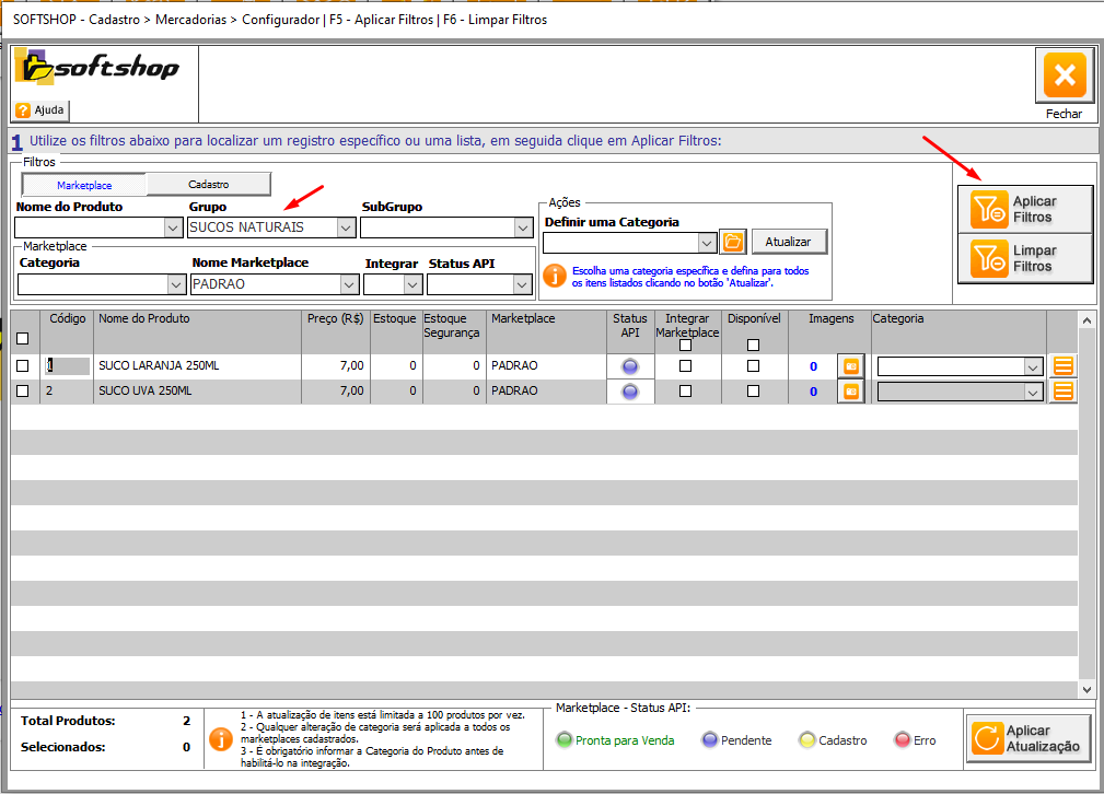 - Utilize os filtros disponíveis para selecionar as mercadorias desejadas. Neste exemplo, filtraremos todas as mercadorias do grupo "SUCOS NATURAIS". Após isso, clique em "Aplicar Filtros" para confirmar a seleção.